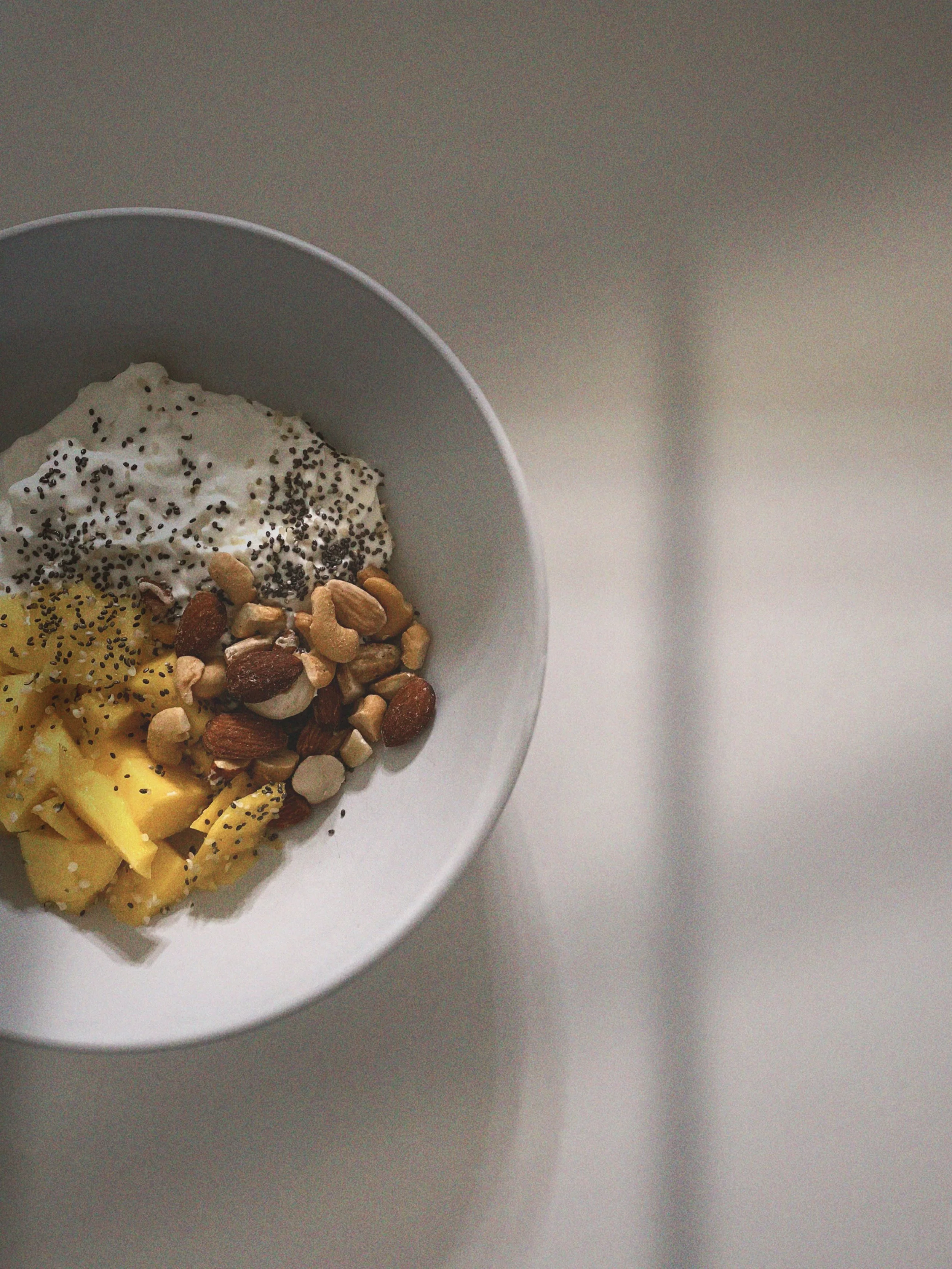2. Mix yogurt and cottage cheese in one side of the bowl.