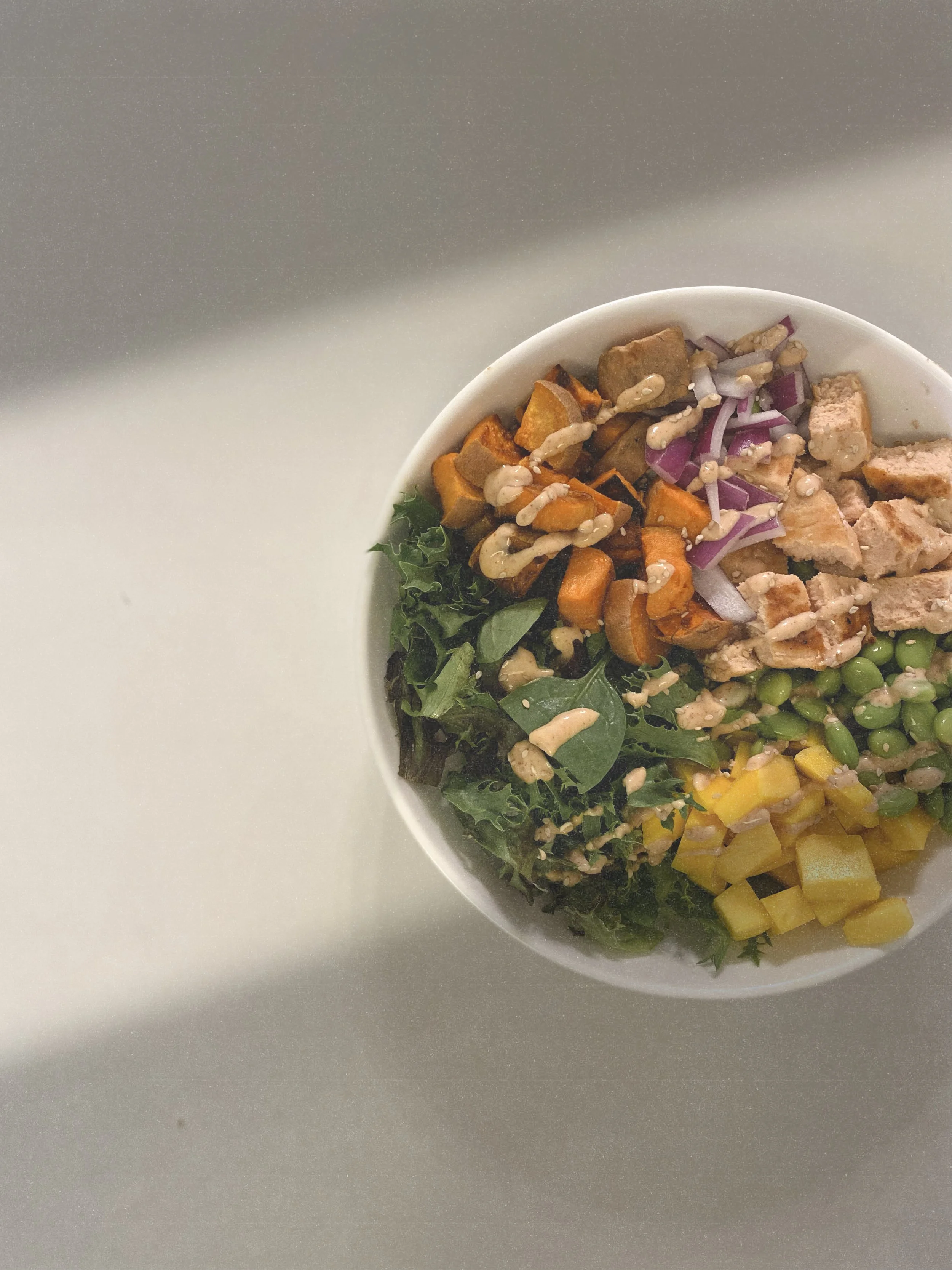 1. Assemble bowl starting with lettuce then add remaining ingredients, alternating between orange and green colors.